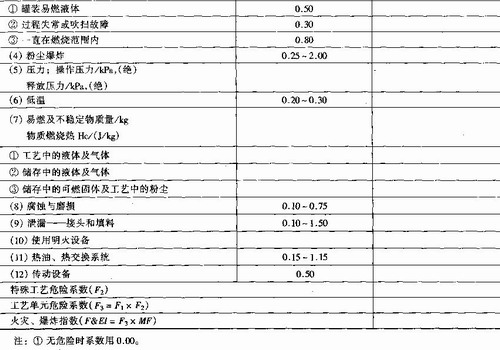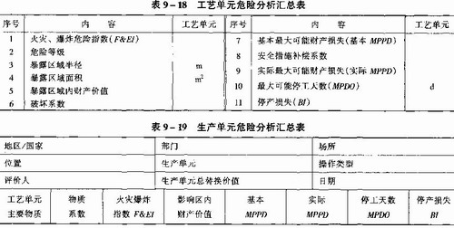 (2)分析、计算、评价需要填写火灾、爆炸指数计算表(表9—16)、安全措施补偿系数表(表9—17)、工艺单元危险分析汇总表(表9—18)、生产单元风险分析汇总表(表9—19)。