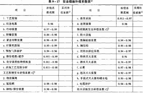 安全预防措施分工艺控制、物质隔离、防火措施3个方面。其中,工艺控制补偿系数包括应急电源等9项措施,物质隔离补偿系数包括遥控阀等4项措施,防火措施补偿系数包括泄漏检测装置等9项措施。