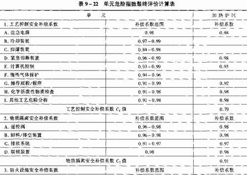 表9—21、表9—22为某炼油厂延迟焦化装置安全预评价中加热炉区单元《道七版》指数评价的实例。