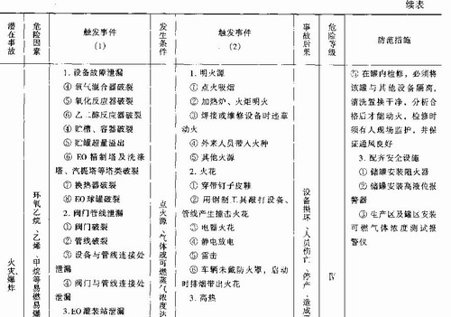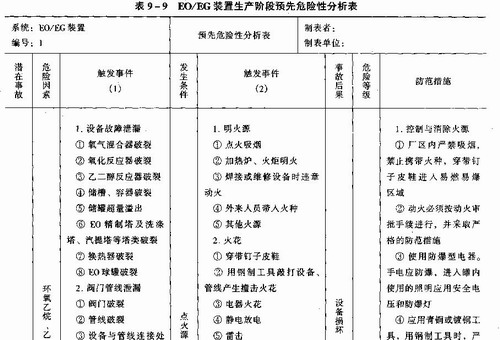 例1某乙烯厂环氧乙烷/乙二醇(EO/EG)在役装置安全评价预先危险性分析按表9—8的形式,对EO/EG装置进行预先危险性分析,分析结果见表9—9。