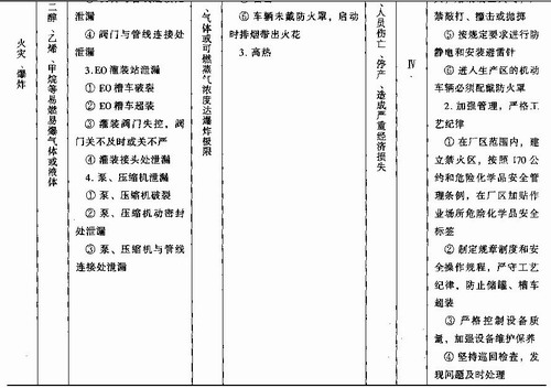 通过预先危险性分析可以得知,本装置存在着火灾、爆炸、中毒、高温灼伤的危险、危害因素,但主要危险为火灾、爆炸,其危险等级为Ⅳ级(破坏性的)。引发火灾爆炸的主要因素是环氧乙烷、乙二醇等物料故障泄漏。