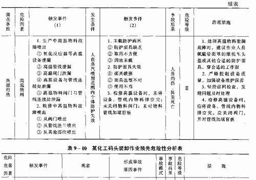 例2某新建化工码头安全预评价预先危险性分析对某新建化工码头项目进行劳动安全卫生预评价,对码头装卸作业进行预先危险性分析并提出了防范措施,分析结果见表9—10。