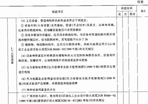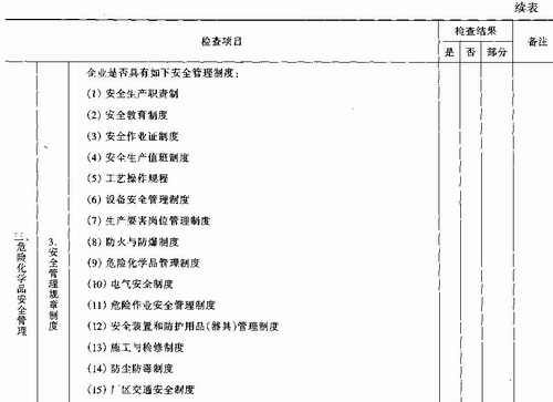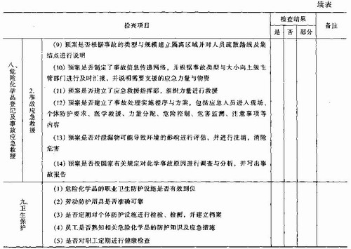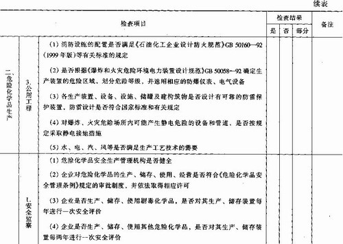 依据我国《中华人民共和国安全生产法》、《中华人民共和国劳动法》、《危险化学品安全管理条例》、《石油化工企业设计防火规范》CB 50160-92(1999年版)等法律、法规、标准,并结合企业实际生产情况,从危险化学品安全生产、储存、使用与管理等方面,编制安全检查表,检查企业的安全状况。表中检查结果以“是”、“否”、“部分符合”来表达,具体见表9—6。