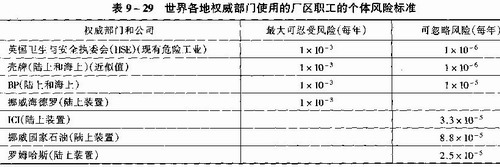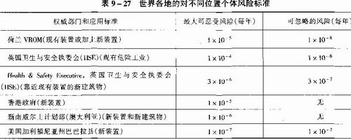 世界各地权威部门和公司使用的不同的个体风险标准见表9—29,它们都是指死亡风险。
