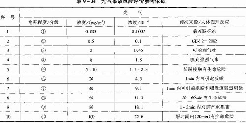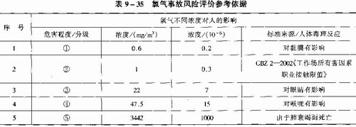 根据光气、氯气的空气环境浓度限值、车间卫生标准及有关的人体毒理反应资料,在表9—34、表9—35中列出了本项目事故风险评价的参考依据。