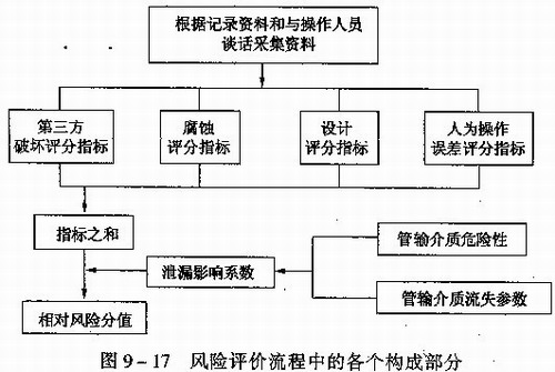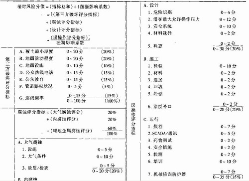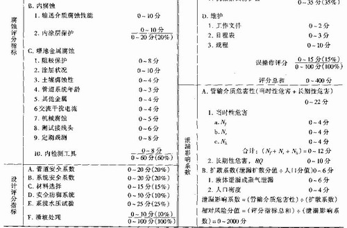 美国从20世纪70年代开始进行油气管道风险分析方面的研究工作,并很快在许多管道公司进行了实际应用,到90年代初期美国的许多油气输送管道都采用了风险管理技术来指导线路维护工作。美国WKM咨询公司总裁在1992年由海湾出版公司出版的《管道风险管理手册》中详细论述了管道风险评价模型和各种评价方法。该书经作者修订于1996年出版了第二版,相对第一版而言,作者在第二版中增加了约三分之一的篇幅来论述读者如何根据自己所面对的评价对象按规定修正基本风险评价模型,并在风险管理部分补充了成本与风险的关系的内容。到目前为止,该书所介绍的风险评价模型仍是世界各国普遍采用的惟一模型。该模型由图9—17所示的框图给出。该模型是通过一种评分指标法来具体进行管道风险评价的,详见表9—26。