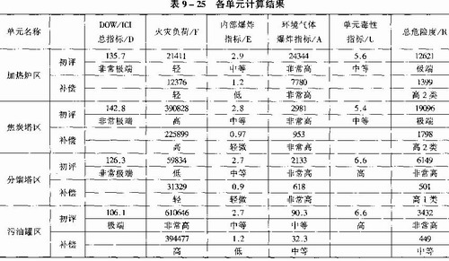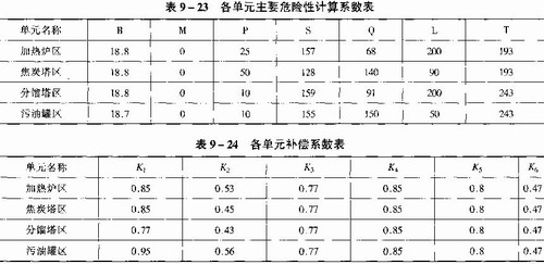 将初期评价的各危险性系数值列于表9—23,各单元的补偿系数值列于表9—24,各单元计算结果列于表9—25。