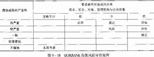 NeoCorr工程有限公司是加拿大卡尔加里市的一家私人公司,公司主要业务是使用先进的腐蚀管理软件为缓解内外腐蚀和制定维护规则提供咨询服务。其中该公司使用的评价工具是一个CMI(CorrosionManagementInterface)软件,该软件的评价结果可以告诉用户管道最有可能发生破坏事故的部位,以便使用户对危险管段引起重视。CMl软件首先采用一个"QUIKRANK"模块将评价管段按危险程度进行分类,用户可以方便地根据评价值所处矩阵单元的位置来判断哪部分管段需进行详细风险评价,哪些管段无需作风险评价。这个被称为“高级风险评价矩阵”的构成要素如图9—18所示。