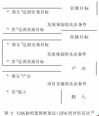 但基于项目水平的评估执行程序恰恰与此相反( 见图 2) 。展示了美国国际开发署( United StatesAgency for International Development, USAID) 1970年开发并使用的逻辑框架法 ( Logical Framework Approach, LFA) 。它根据项目评估的目标和不同评估层次的因果关系, 在垂直关系上把评价执行程序分为投入、产出、直接目标和宏观目标 4 个层次。以投入作为项目实施产出的先决条件, 以产出作为项目发展实现直接目标的先决条件, 以达成直接目标作为发展规划的先决条件。并考虑各个阶段的不确定因素, 参考项目效果实现的逻辑关系实行评估。它适用于项目计划、实施和评估的各个阶段, 尤其适用于项目实施后阶段的自我评价、项目成败原因分析、项目可持续评价等[10]。