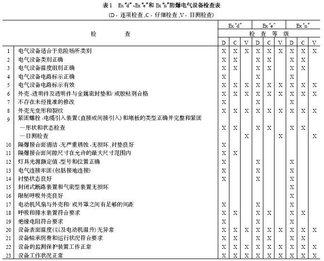 根据防爆电气设备的特点,参考IEC 60079-17中的检查项目表,将隔爆型、增安型和无火花型电气设备检查工作中涉及到设备本身防爆结构和与防爆安全相关的检查项目列于表1。