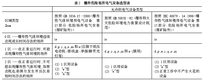从表2 可以看出,0区的危险程度高,仅仅允许安装安全性高的本质安全型仪表类设备;2区出现爆炸性气体的概率很低,允许安装和使用“n”型或正常工作中不产生火花的普通电气设备(IEC 标准)。
