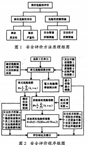 该评价方法以作业条件危险性评价法为基础,参考和借鉴道化学评价法,易燃、易爆、有毒重大危险源评价技术和安全控制论评价法的思想和优点,采用定性和定量相结合的手段,对系统单元危险状况和系统整体危险程度进行定量描述和评价。该评价方法把企业生产系统分为固有危险性系统和危险控制措施系统,企业现状危险性实际上就是这两部分相互作用、相互抵消的结果。其评价原理见图1,评价程序见图2。