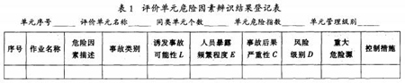 危险因素指对人造成伤亡或对物造成突发性损害的因素[2]。国家安全生产监督管理局在《关于重大危险源申报登记试点工作的指导意见》[4]中将重大危险源划分为12类,对照国家相关标准,在危险因素识别的基础上找出重大危险源,并用FTA做进一步分析。危险因素识别和分析有9项内容,采用LEC法[2]评价这些因素危险性的大小,危险性分值大于320[2]的也视为重大危险源。参考已有危险识别方法[3],结果以登记表的形式反映出来,见表1。