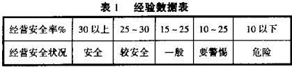 对企业的经营安全状况进行评价,既要掌握目前企业的经营状况,又要考虑到将来各种风险因素对企业经营的影响。企业目前的经营状况可以通过有关的指标来分析,例如可以用一种较简单的分析指标 MS比率判断目前的经营安全状况。该指标的计算式为:MS比率=( 当期销售收人一保本点销售收人) / 当期销售收人, MS比率越高, 说明企业的经营安全状况越好,可结合表 1中经验数据对具体企业的经营安全状况加以判断。