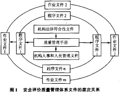 质量保障体系文件一般分为三个层次:管理手册(一级)、程序文件(二级)、作业文件(三级),如图1和图2所示。评价机构法律符合性、机构人事和人员管理文件为质量管理手册提供最基本的法律保障,管理手册是描述保障体系方针和目标的纲领性文件,是一级文件;程序文件是管理手册的扩展,描述体系所涉及的各个职能部门进行安全评价的方法和途径,是二级文件;作业文件是描述如何完成某项工作任务的具体做法的详细的工作文件,是程序文件的进一步扩展是三级文件。三级文件结合起来构成了安全评价质量保障体系,作业文件作为程序文件的支撑,在编写程序文件时应体现作业文件的查找路径。同样,程序文件是管理手册的支撑,管理手册应详细注明程序文件的查找路径。