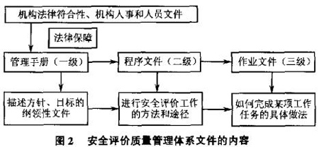安全评价质星保障体系文件主要由评价机构法律符合性文件、机构入事和人员管理文件、质量管理手册、程序文件和作业文件四部分组成。安全评价质量保障体系的存在首先要以评价机构法律符合性、机构人事和人员管理文件为前提,因此,一个完整的安全评价质量管理体系文件也应把这两项包括在内。