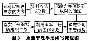 质量管理手册的编写要有系统性避免面面俱到、冗长重复,它不可能像具体工作标准域管理制度那样详尽对各要素.要素间的关系和控制要求只需概括地做出原则规定。在描述时,要求文字准确、语言精练、结构严谨,还要通俗易懂,以便评价机构全体员工能理解和掌握。手册编写程序如图3所示: