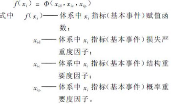 3)基本事件概率重要度原则,即具体煤矿“大系统”中各基本事件发生的概率的变化对顶上事件(即事故)发生概率的影响。基本事件概率重要度越大,通过降低其概率,顶上事件(即事故)发生概率降低越大,事故越不易发生。同一基本事件可能在不同事故树中出现,其概率重要度可加权计算。该排序影响安全评价体系指标中该基本事件或指标的赋值,概率重要度越大,该基本事件赋值越高。综上所述,具体煤矿安全评价体系的具体指标权值的确定由下面函数确定: