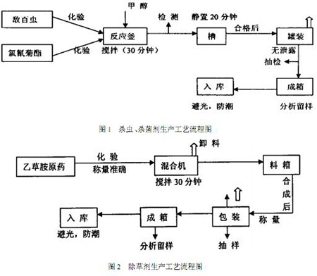 农药生产采用物理配料法生产农药(杀虫剂、杀菌剂和除草剂),原料按一定的比例配料,混合均匀后,采用机械罐装、贴标、得成品。整个系统采用负压操作[1],工艺流程图见图1、2。对于该项目,主要原辅材料为敌百虫、氯氰菊酯、乙草胺、甲醇等。甲醇沸点为64.8℃,能溶解于水、醇、醚、苯等溶剂中,稳定性比较差,其蒸汽能与空气形成爆炸性混合物,爆炸极限为6.7~36%,空气中最高浓度为200ppm.而且甲醇是一种毒性比较高的化合物,对人毒剂量为5~10ml,至死剂量为30ml[2],其蒸气能与空气形成爆炸性混合物,爆炸极限为6.00%~36.5%。