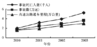 我国高速公路建设发展迅速,但高速公路交通事故伤亡及财产损失,令人触目惊心。从图1可以看出,2000—2003年,高速公路通车里程、事故数以及事故死亡人数分别由1.6万公里、17217起、2015人增加到2.9745万公里、36257起、5269人;随着高速公路通车里程的快速增长,事故数也相应增加,而事故死亡人数增长更快。