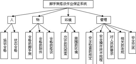 (3) 安全保证体系的建立。根据脚手架搭设作业的特点和事故原因分析的结果,从作业中人、设备、环境和管理四个方面考虑,运用故障树分析法得到脚手架搭设作业保证系统图,如图3所示。