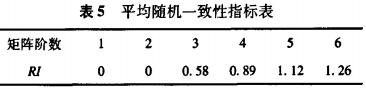 数学专家Saaty给出了1-9阶判断矩阵的RI值,对于n=1,2,RI只是形式上的,因为1,2阶判断矩阵总是完全一致的;当阶数大于2时,一致性指标a与同阶的平均随机一致性指标彤(见表5)之比:CR=CI/RI,称为随机一致性比率,当CR<0。1时,认为矩阵有满意的一致性,否则就要重新调整矩阵,直至具有满意的一致性,从而即为指标的权重。
