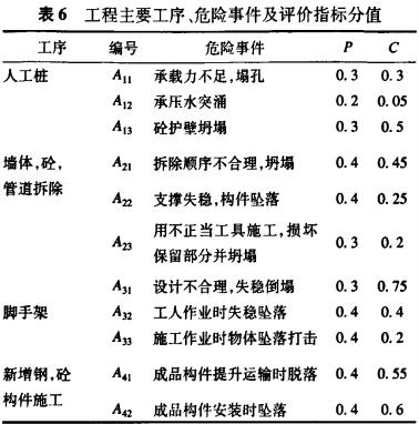 为了方便对此工程施工现场进行安全性评价,采用故障树的方法对此工程施工工序及各工序中的危险事件进行了重点性分解,并确定主要评价指标(见表6)。
