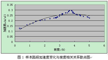 从图中可以看出,加速度随着坡度的增加而逐渐有所增加,回归曲线的拐点位置大约在坡度为3.8%左右的位置上,此后,加速度开始有明显的回落。