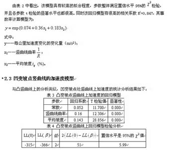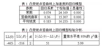 因此,在凸变坡点处竖曲线上的加速度模型中,考虑竖曲线半径和平均坡度两个因素,采用多元回归拟合。在分析中,用曲度1/R来替代竖曲线半径R得出的结果优于直接用竖曲线半径。应用数理统计软件SPSS具体分析结果如下: