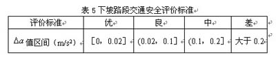 加速度作为速度的核心要素,在一定程度上能够反映出道路线形所引起的车辆行驶状态的变化,反映了车辆行驶时的突然加速或突然减速的不稳定状态,这种变化往往是导致事故发生的原因。因此可以说,加速度是表征道路交通安全的一项客观的指标,加速度变化量就对应着一定的道路安全水平。因此,本文以加速度的变化量为评价道路安全的量化指标,确定下坡路段道路线形设计的评价标准,来评价其安全性和合理性,应当是公路建设与运营管理的有效尝试。