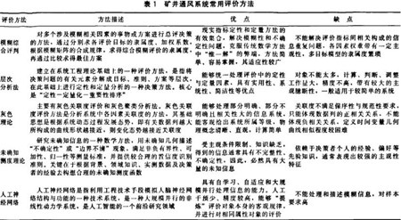 以往对矿井通风系统的评价大多采用安全检查表和专家打分法。安全检查表属于定性评价,不能对整个系统的安全性给出确定的结果;专家打分法虽然属于定量评价,但专家各自的权莺很难确定,操作起来也较困难。上述方法作为安全管理的手段之一是可行的,但作为对系统危险程度的评价,以各指标的得分值作为评价依据,其结果缺乏说服力。随着矿业的发展,国内矿井通风专家学者对评价方法及标准作了大量的研究,提出了多种多样的评价方法,其主要方法见表l。