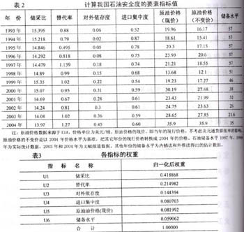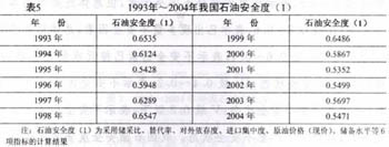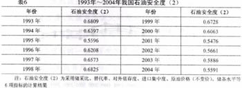 如果用表2中的原油价格(不变价)代替上述计算过程中的原油价格(现价),得到的1993年~2004年我国油安全度值的计算结果见表6。