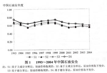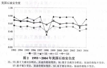 4、1993年~2004年美国石油安全度总体在0.3142~0.7747之间(图2),平均为0.6023,而我国平均为0.6381,如果只考虑常态形势下的可量化指标,我国石油安全形势还略好于美国,这与六个单项要素指标分析的结果是一致的。在六个单项要素指标中,储量替代率、进口集中度、我国与美国大致相当,储备水平美国优于我国,而储采比和对外依存度两个指标则我国大大优于美国。这说明我国石油的安全形势有利的一面,国外某些势力极力喧染中国石油威胁论是没有根据的,是别有用心的。但同时我们也要看到对我国石油安全不利的一面,这方面恰恰是本课题评价尚未考虑的一些非常态因素:一是国情不一样,对石油安全形势的评价标准也不一样我们不便以自己的标准来评判别国的形势。二是美国作为当今世界唯一的超级大国,其经济实力和军事实力远超中国.它可以凭借其经济和军事力量来保障其石油供应和石油运输通道的安全,并对国际石油市场和价格波动显示出很强的调整及承受能力,这是中国至今还难以做到的。如若全面考虑这些非常态因素,中国的石油安全形势将比美国更为严峻,这是我们应当充分估计到的,清醒认识的。