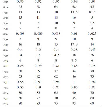 瓦斯爆炸的必要条件有3 类[1]。根据危险源理论[2]和评价指标选择原则,确定了掘进面瓦斯爆炸评价指标体系。掘进面瓦斯爆炸第一类危险源指标体系为:x101 (平均断层落差,m)、x102 ( 单位长度断层条数,1/100 m)、x103 (顶板类型)、x104 ( 平均瓦斯涌出量,m3 /min)、x105自燃发火期(月);第二类危险源指标体系为:x201 ( 平均风速,m/min)、x202风扇完好率(局扇)、x203 ( 100 m 风筒漏风率)、x204 (防爆设备完好率)、x205 ( 风量供需比)、x206 (瓦斯抽放率)、x207 ( 瓦斯抽放设备完好率)、x208 ( 通讯设施完好率)、x209 ( 通防设施完好率)、x210 (机械化程度,分);第三类危险源指标体系为:x301 (管理人员受教育年限,a)、x302 (管理人员平均工龄,a)、x303 ( 管理人员平均资历,a)、x304 (技术人员平均工龄,a)、x305 (技术人员所占比例)、x306 ( 工人受教育年限,a)、x307 (工人平均工龄,a)、x308 (民工合同工所占比重)、x309 ( 工人平均年龄,a)、x310 ( 工人平均受培训时间,a)、x311 (安全投入兑现率)、x312 ( 安全教育,分)、x313 (管理干部安全监察水平,分)、x314 ( 安全人员出勤率)、x315 ( 安全责任制执行率)、x316 (员工的技能和经验,分)、x317 (员工的职业责任感,分)、x318 (规程标准化执行水平,分)
