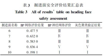先将掘进面6 作为BP 网络的训练样本,共11个样本,进行BP 网络训练,待训练稳定后,对掘进面6 进行评价。其安全评价结果为0. 4775,对应安全评价等级取值范围,可知掘进面6 安全评价等级为Ⅲ。同理,按上述方法可得到7、8、9、10 掘进面的安全评价结果。其结果汇总于表3。