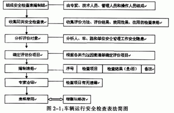 定性分析方法主要有:安全检查表法(如图2-1)、预先危险分析法等。车辆运行安全检查表根据检查目的和范围可以设计成多种形式:日常安全检查表、车辆交通事故隐患整改安全检查表和专项安全检查表等。由于该种方法能够提供定性分析,可作为定量评价中获取指标描述的方式之一。