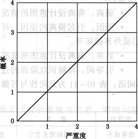 沿矩阵原点到右上角画一对角线,并将所有故障类型按其严重度和发生概率填入矩阵图中,就可看出系统风险的密集情况。处于右上角方块中的故障类型风险率最高,依次左移逐渐降低。但值得提醒注意的是,有的故障类型虽然有高的发生概率,但造成危害的严重度甚低,因而风险率也低;另一种情况,即使危害的严重度很大,但发生概率很低,所以风险率也不会高。