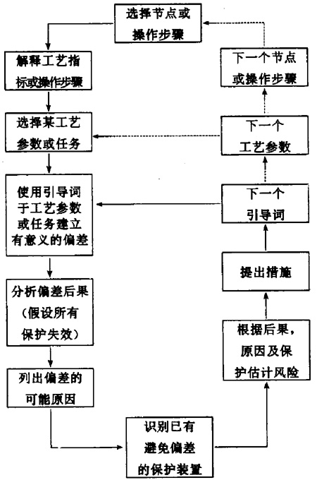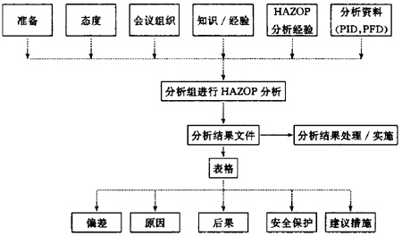 由图可见,HAZOP分析的整个过程可分为分析的准备、实施分析、编制分析结果报告三个阶段。应该注意在分析过程中,根据分析需要分析步骤可交替进行,如分析组在完成某个分析节点后(不是全部),可将结果提交给设计人员,让设计人员着手对原设计进行修改。