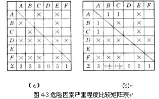 具体方法是列出矩阵表。设某系统共有6个危险因素需要进行等级判别,可分别用字母A,B,C,D,E,F代表,画出一个如图4-3(a)所示的方阵。按方阵图中顺序,比较每一列因素的严重性。用“×”号表示在列里严重、在行里不严重的因素。例如比较因素A和B,A比B严重,则在一列二行空格内画“×”号。再比较因素A和C,A比C不严重,在一列三行空格内不画“×”号。照此方法,依次一一对应比较后,可得出每一列画“×”号的总和。图4-3(a)中结果是: