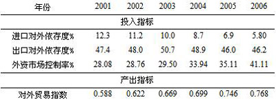 选择投入产出指标主要考虑以下方面:首先,所选择的指标能够满足评价的要求,客观反映评价对象的安全度;其次,从技术上尽量避免投入产出内部指标间具有较强的线性关系;根据评价目的和选择指标的要求,设置输入指标为:外资市场控制率、进口依存度、出口依存度;输出指标为:国际竞争力指数、产业发展速度[4]。