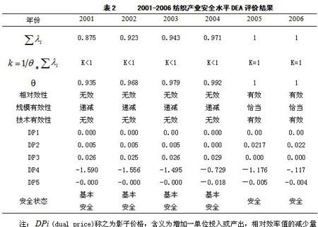 1.安全度分析。从表2的评价结果可以看出,2005和2006年评价结果为DEA有效,即产业安全状态达到最优;其它年份的DEA值均小于1,为非DEA有效,即产业处于非安全状态。总体来看,从2001-2006年这六年期间,我国纺织行业产业安全度水平呈不断上升的趋势。