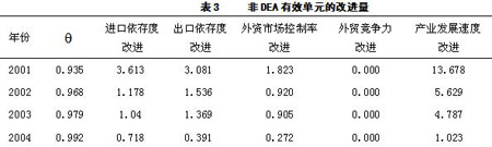 从对非DEA有效的单元进行调整,我们得出,我国纺织近几年的发展过程中,尤其是近几年对外贸易量不断增加,从1997-2006年平均速度在14.6%以上,同时外商对纺织的投资也呈明显的上升趋势。这在促进我国纺织经济发展的同时,也给我国纺织产业的安全问题带来了隐患。这从发展过程中纺织进出口依存度和三资企业固定资产的缩减量上就可以看出。我国有丰富的纺织原料和劳动力资源,但是是我些并没有转化成明显的纺织产业竞争优势。所以目前适当的对外贸易和外资才有利于我国纺织产业的发展,表中的中的数据表明我国纺织行业要达到DEA有效,即达到产业安全,应减少其进出口依存度和外商对纺织的投资。