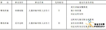 以表格的形式汇总分析结果。典型的结果汇总表包括主要的事故、产生原因、可能的后果、危险性级别和应采取的措施等栏目。