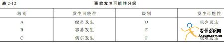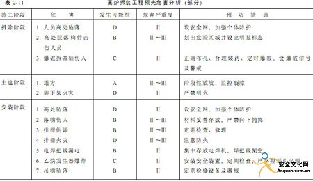 在钢铁厂里需要定期进行高炉大修。鞍山钢铁公司针对高炉拆装工程进行的预先危害分析结果汇总列于表2-11。其中,把危险性分为发生事故可能性和后果严重程度两栏。发生事故可能性等级划分见表2-12。