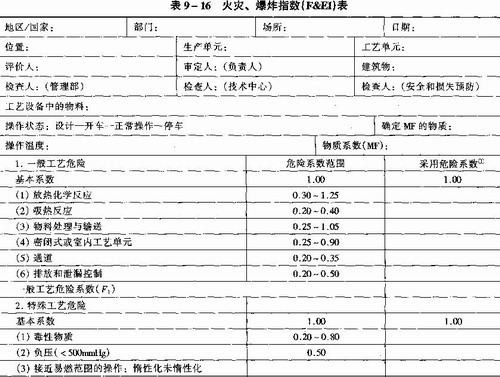 (2)分析、计算、评价需要填写火灾、爆炸指数计算表(表9—16)、安全措施补偿系数表(表9—17)、工艺单元危险分析汇总表(表9—18)、生产单元风险分析汇总表(表9—19)。
