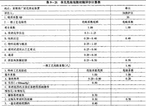 表9—21、表9—22为某炼油厂延迟焦化装置安全预评价中加热炉区单元《道七版》指数评价的实例。