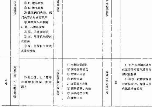 例1某乙烯厂环氧乙烷/乙二醇(EO/EG)在役装置安全评价预先危险性分析按表9—8的形式,对EO/EG装置进行预先危险性分析,分析结果见表9—9。