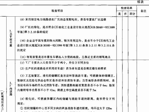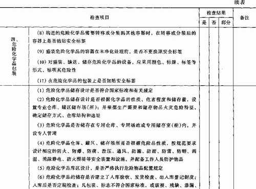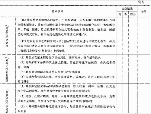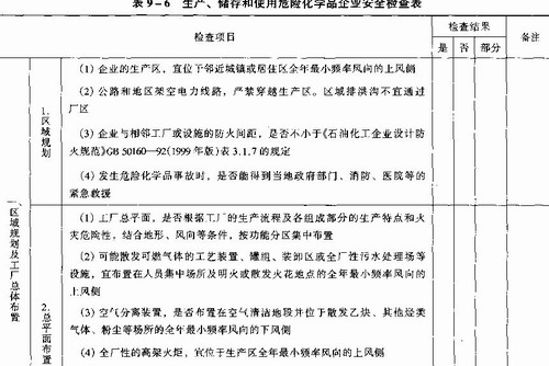 依据我国《中华人民共和国安全生产法》、《中华人民共和国劳动法》、《危险化学品安全管理条例》、《石油化工企业设计防火规范》CB 50160-92(1999年版)等法律、法规、标准,并结合企业实际生产情况,从危险化学品安全生产、储存、使用与管理等方面,编制安全检查表,检查企业的安全状况。表中检查结果以“是”、“否”、“部分符合”来表达,具体见表9—6。