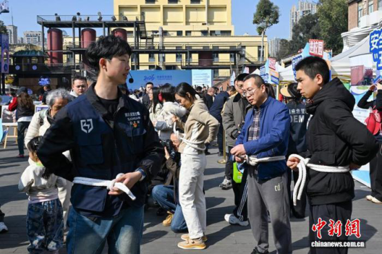 一名应急工作人员现场指导民众学习逃生绳结的打法。记者 刘忠俊 摄