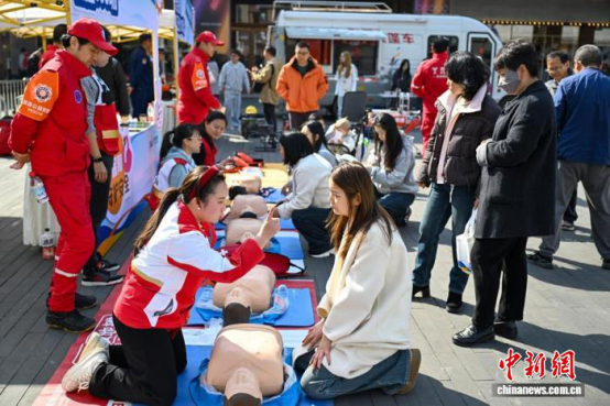 救护人员现场指导民众学习急救方法。记者 刘忠俊 摄